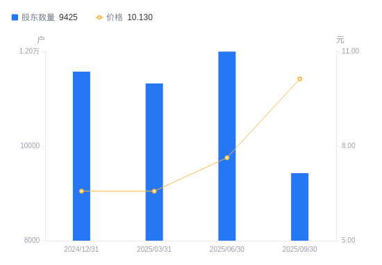 近一年(2024年9月30日至2025年9月30日),通用电梯A股股东户数从1.29万户,减低至9425户,降幅27.09%,区间股价上涨77.72%。
