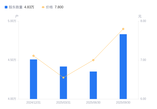 近一年(2024年9月30日至2025年9月30日),合肥城建A股股东户数从3.54万户,增加至4.83万户,增幅36.53%,区间股价上涨16.59%。