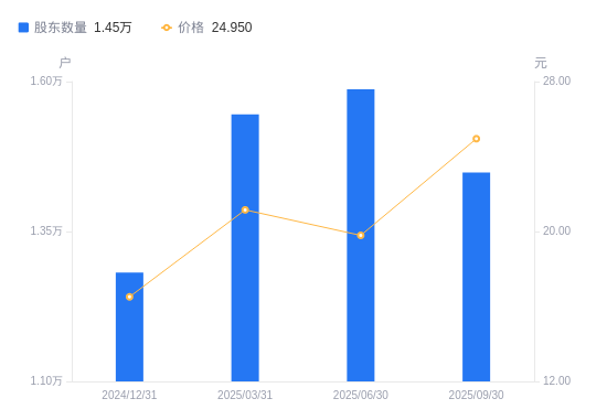 近一年(2024年9月30日至2025年9月30日),海晨股份A股股东户数从1.23万户,增加至1.45万户,增幅18.07%,区间股价上涨66.97%。