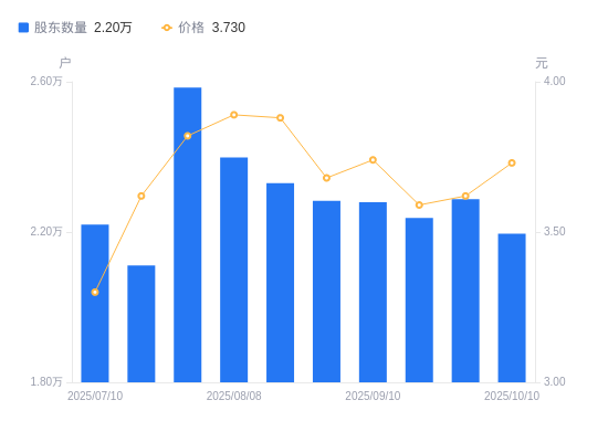 近一年(2024年9月30日至2025年9月30日),扬子新材A股股东户数从2.09万户,增加至2.29万户,增幅9.35%,区间股价上涨25.69%。
