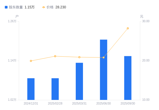 近一年(2024年9月30日至2025年9月30日),中复神鹰A股股东户数从1.05万户,增加至1.15万户,增幅9.58%,区间股价上涨45.07%。