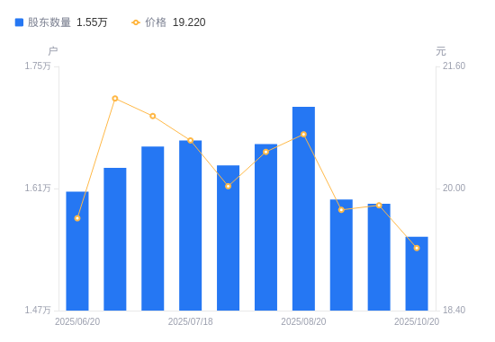 近一年(2024年10月20日至2025年10月20日),迦南智能A股股东户数从1.9万户,减低至1.55万户,降幅18.39%,区间股价下跌9.89%。