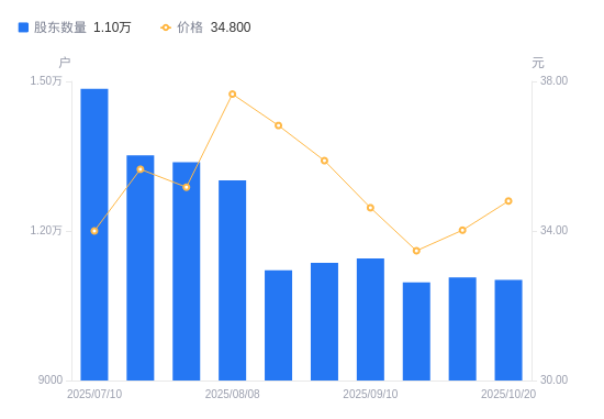 近一年(2024年10月31日至2025年10月20日),富士莱A股股东户数从1.15万户,减低至1.1万户,降幅4.45%,区间股价上涨33.44%。