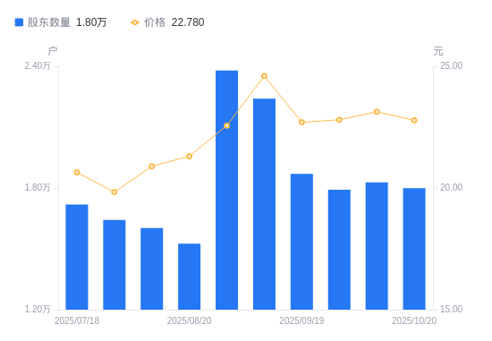 近一年(2024年10月31日至2025年10月20日),长江材料A股股东户数从1.17万户,增加至1.8万户,增幅54.28%,区间股价上涨45.20%。