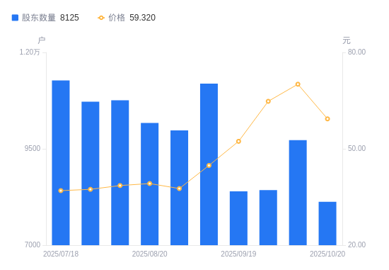 近一年(2024年10月31日至2025年10月20日),锡装股份A股股东户数从1.11万户,减低至8125户,降幅26.56%,区间股价上涨71.74%。