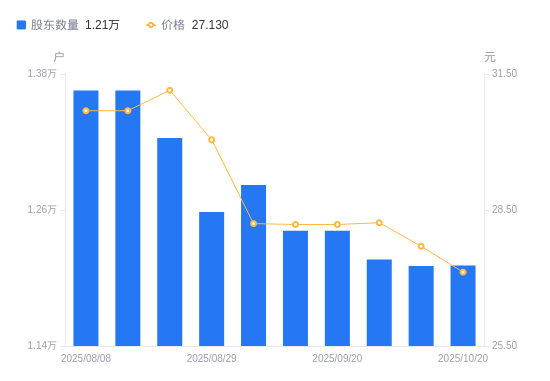 近一年(2024年10月31日至2025年10月20日),亚华电子A股股东户数从1.6万户,减低至1.21万户,降幅24.35%,区间股价下跌19.80%。
