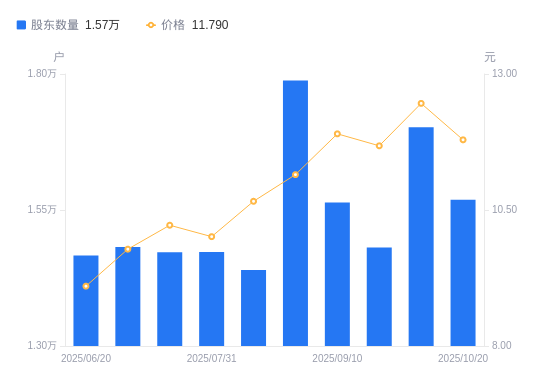 近一年(2024年10月31日至2025年10月20日),丽岛新材A股股东户数从1.3万户,增加至1.57万户,增幅20.45%,区间股价上涨36.77%。