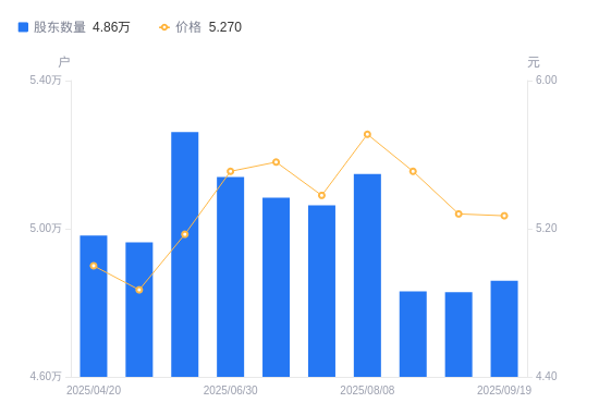 10月21日消息,数据显示,截至2025年9月30日,海伦哲A股股东总户数为5.24万户,较上期(2025年9月19日)增加3789户,增幅7.80%。公司最新A股总股本为10.09亿股,其中流通A股10.05亿股,户均持有流通A股数量为1.92万股,较上期减少1496.37股,降幅7.23%;户均持流通A股市值10.58万元,较上期减少3279.67元,降幅3.01%。