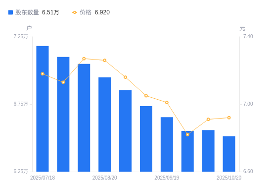 近一年(2024年10月31日至2025年10月20日),国投丰乐A股股东户数从6.98万户,减低至6.51万户,降幅6.67%,区间股价下跌3.35%。