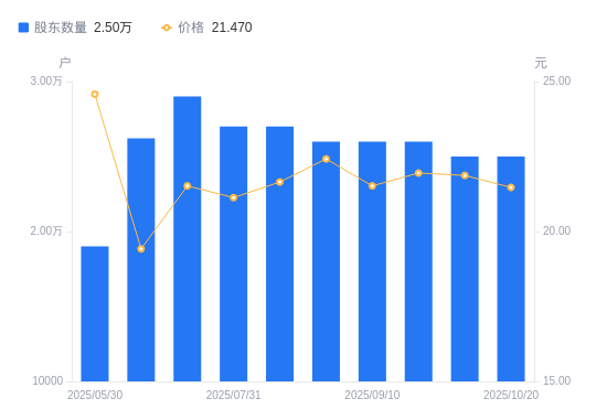 近一年(2024年11月29日至2025年10月20日),瑞普生物A股股东户数从1.6万户,增加至2.5万户,增幅56.25%,区间股价上涨9.50%。