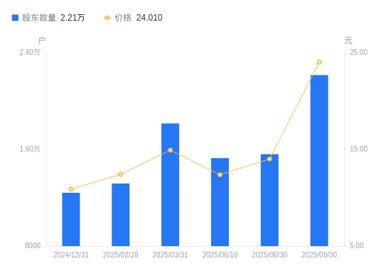 近一年(2024年9月30日至2025年9月30日),海昌新材A股股东户数从1.38万户,增加至2.21万户,增幅60.71%,区间股价上涨174.12%。
