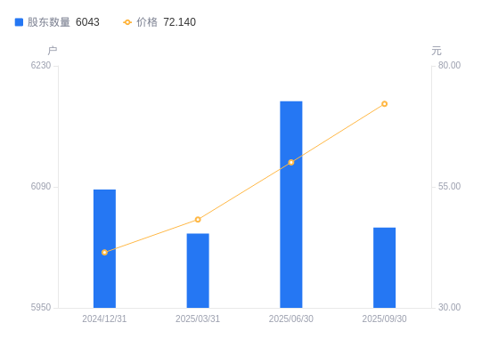 近一年(2024年9月30日至2025年9月30日),迈普医学A股股东户数从5336户,增加至6043户,增幅13.25%,区间股价上涨72.20%。