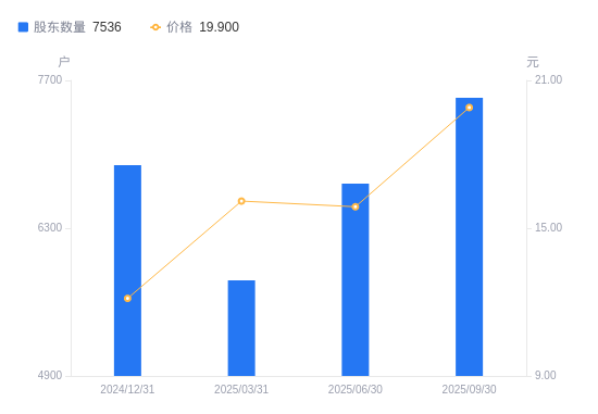 10月23日消息,数据显示,截至2025年9月30日,中科通达A股股东总户数为7536户,较上期(2025年6月30日)增加814户,增幅12.11%。公司最新A股总股本为1.16亿股,其中流通A股1.16亿股,户均持有流通A股数量为1.54万股,较上期减少1869.99股,降幅10.80%;户均持流通A股市值30.73万元,较上期增加3.26万元,增幅11.85%。