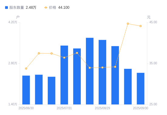 10月23日消息,数据显示,截至2025年9月30日,广东宏大A股股东总户数为2.48万户,较上期(2025年9月19日)减少1344户,降幅5.14%。公司最新A股总股本为7.6亿股,其中流通A股6.6亿股,户均持有流通A股数量为2.66万股,较上期增加1369.55股,增幅5.42%;户均持流通A股市值117.46万元,较上期增加4.59万元,增幅4.07%。