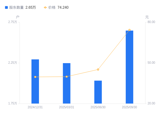 近一年(2024年9月30日至2025年9月30日),派能科技A股股东户数从2.32万户,增加至2.65万户,增幅13.87%,区间股价上涨78.24%。