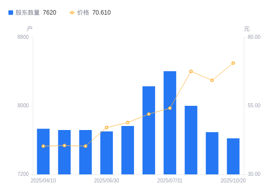 近一年(2024年12月20日至2025年10月20日),硕世生物A股股东户数从8109户,减低至7620户,降幅6.03%,区间股价上涨63.16%。