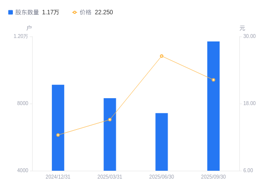 近一年(2024年9月30日至2025年9月30日),中环海陆A股股东户数从1.02万户,增加至1.17万户,增幅15.03%,区间股价上涨93.48%。