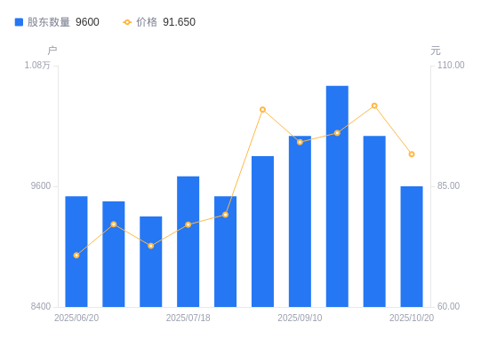 近一年(2024年11月29日至2025年10月20日),儒竞科技A股股东户数从1.2万户,减低至9600户,降幅20.00%,区间股价上涨53.03%。