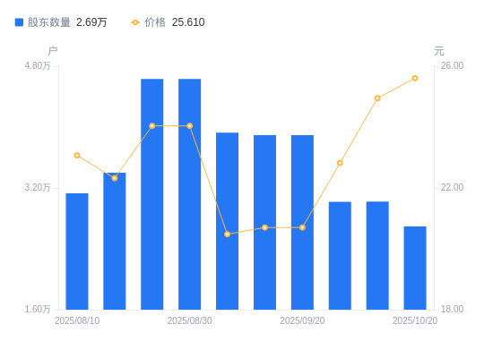 近一年(2024年10月31日至2025年10月20日),星网宇达A股股东户数从4.11万户,减低至2.69万户,降幅34.38%,区间股价上涨31.47%。