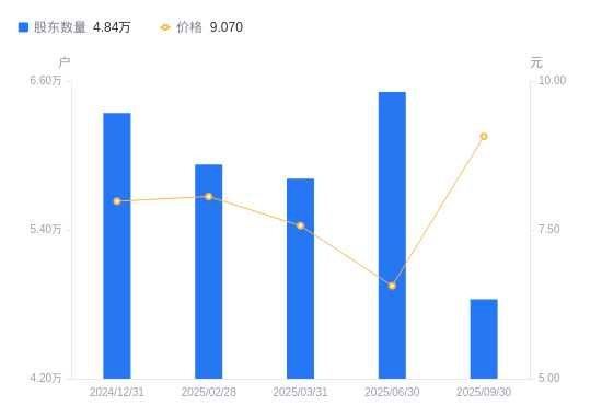 近一年(2024年9月30日至2025年9月30日),华峰化学A股股东户数从6.27万户,减低至4.84万户,降幅22.87%,区间股价上涨19.66%。
