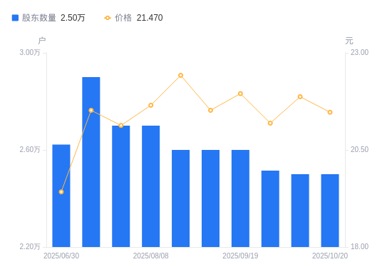 10月24日消息,数据显示,截至2025年9月30日,瑞普生物A股股东总户数为2.51万户,较上期(2025年9月19日)减少856户,降幅3.29%。公司最新A股总股本为4.65亿股,其中流通A股3.35亿股,户均持有流通A股数量为1.33万股,较上期增加438.59股,增幅3.40%;户均持流通A股市值28.23万元,较上期减少497.41元,降幅0.18%。