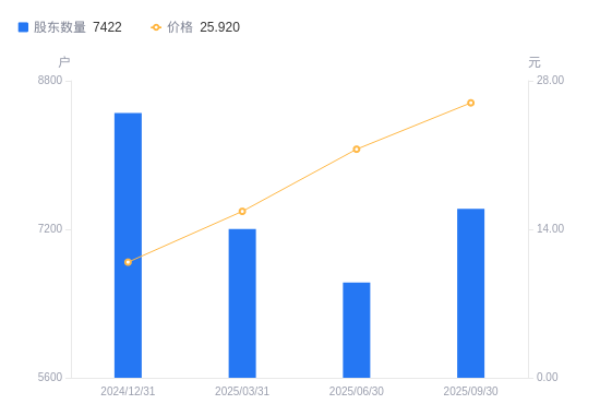 近一年(2024年9月30日至2025年9月30日),雅运股份A股股东户数从8956户,减低至7422户,降幅17.13%,区间股价上涨179.31%。