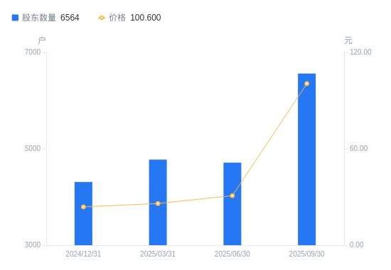 10月24日消息,数据显示,截至2025年9月30日,品茗科技A股股东总户数为6564户,较上期(2025年6月30日)增加1852户,增幅39.30%。公司最新A股总股本为7884.23万股,其中流通A股7884.23万股,户均持有流通A股数量为1.2万股,较上期减少4720.92股,降幅28.21%;户均持流通A股市值120.83万元,较上期增加69.25万元,增幅134.22%。