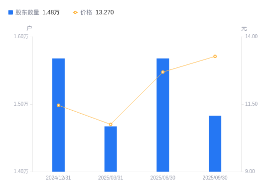 10月24日消息,数据显示,截至2025年9月30日,豪尔赛A股股东总户数为1.48万户,较上期(2025年6月30日)减少852户,降幅5.43%。公司最新A股总股本为1.5亿股,其中流通A股1.14亿股,户均持有流通A股数量为7702.97股,较上期增加418.58股,增幅5.75%;户均持流通A股市值10.22万元,较上期增加9779.52元,增幅10.58%。