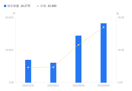 近一年(2024年9月30日至2025年9月30日),长城军工A股股东户数从5.7万户,增加至18.27万户,增幅220.47%,区间股价上涨324.68%。