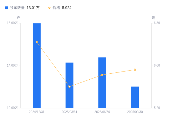 近一年(2024年9月30日至2025年9月30日),五矿资本A股股东户数从6.11万户,增加至13.01万户,增幅113.03%,区间股价下跌1.53%。