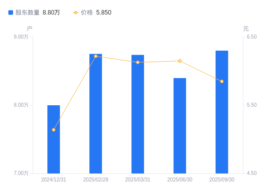 10月24日消息,数据显示,截至2025年9月30日,华北制药(维权)A股股东总户数为8.8万户,较上期(2025年6月30日)增加4026户,增幅4.79%。公司最新A股总股本为17.16亿股,其中流通A股17.16亿股,户均持有流通A股数量为1.95万股,较上期减少934.51股,降幅4.57%;户均持流通A股市值11.4万元,较上期减少1.16万元,降幅9.23%。
