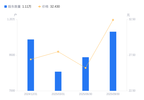 近一年(2024年9月30日至2025年9月30日),蓝特光学A股股东户数从8918户,增加至1.11万户,增幅24.93%,区间股价上涨94.54%。