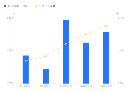 10月24日消息,数据显示,截至2025年9月30日,振华新材A股股东总户数为1.69万户,较上期(2025年9月24日)增加788户,增幅4.89%。公司最新A股总股本为5.09亿股,其中流通A股5.09亿股,户均持有流通A股数量为3.01万股,较上期减少1472.44股,降幅4.66%;户均持流通A股市值49.07万元,较上期增加1.77万元,增幅3.74%。