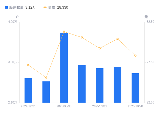 10月24日消息,数据显示,截至2025年9月30日,东方中科A股股东总户数为3.34万户,较上期(2025年9月19日)增加429户,增幅1.30%。公司最新A股总股本为3亿股,其中流通A股2.35亿股,户均持有流通A股数量为7045.26股,较上期减少91.76股,降幅1.29%;户均持流通A股市值21.42万元,较上期增加5631.24元,增幅2.70%。
