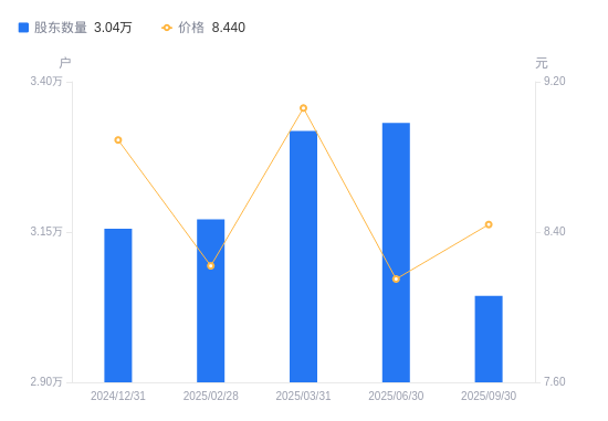 近一年(2024年9月30日至2025年9月30日),民和股份A股股东户数从3.33万户,减低至3.04万户,降幅8.70%,区间股价上涨0.60%。