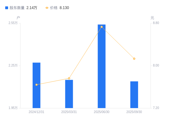 近一年(2024年9月30日至2025年9月30日),谱尼测试A股股东户数从2.28万户,减低至2.14万户,降幅6.41%,区间股价上涨10.01%。