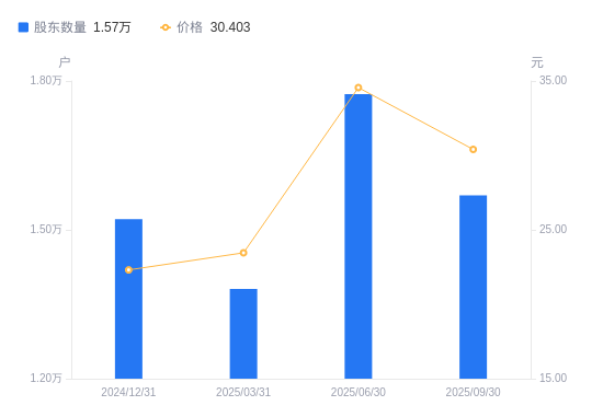 近一年(2024年9月30日至2025年9月30日),天元宠物A股股东户数从1.24万户,增加至1.57万户,增幅26.83%,区间股价上涨63.11%。