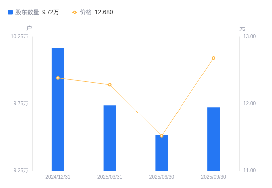 近一年(2024年9月30日至2025年9月30日),京山轻机A股股东户数从10.12万户,减低至9.72万户,降幅3.94%,区间股价上涨12.91%。