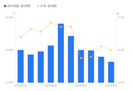 近一年(2024年10月10日至2025年10月10日),航天彩虹A股股东户数从8.58万户,增加至12.23万户,增幅42.57%,区间股价上涨23.94%。