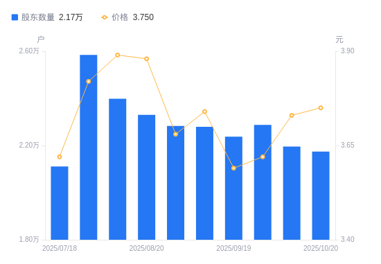 近一年(2024年10月31日至2025年10月20日),扬子新材A股股东户数从2.61万户,减低至2.17万户,降幅16.80%,区间股价上涨21.75%。