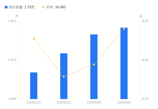 近一年(2024年9月30日至2025年9月30日),万里石A股股东户数从1.28万户,增加至1.73万户,增幅34.96%,区间股价上涨25.87%。
