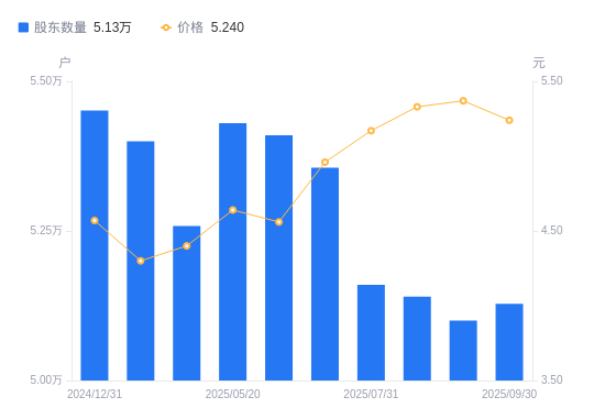 近一年(2024年9月30日至2025年9月30日),天原股份A股股东户数从5.87万户,减低至5.13万户,降幅12.61%,区间股价上涨23.00%。