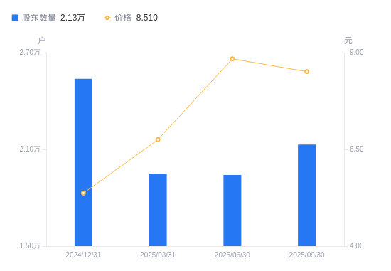 近一年(2024年9月30日至2025年9月30日),吉峰科技A股股东户数从2.67万户,减低至2.13万户,降幅20.10%,区间股价上涨109.61%。