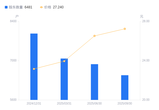 近一年(2024年9月30日至2025年9月30日),恒达新材A股股东户数从8233户,减低至6481户,降幅21.28%,区间股价上涨23.68%。