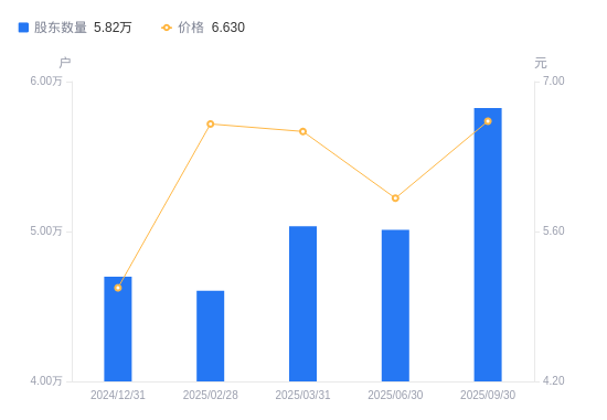 近一年(2024年9月30日至2025年9月30日),天润工业A股股东户数从4.1万户,增加至5.82万户,增幅42.08%,区间股价上涨54.40%。