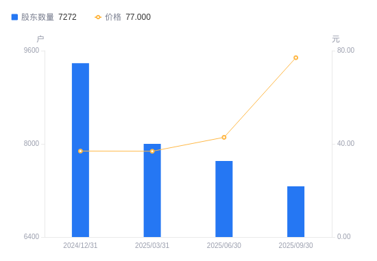 近一年(2024年9月30日至2025年9月30日),卡莱特A股股东户数从1.04万户,减低至7272户,降幅30.22%,区间股价上涨120.73%。