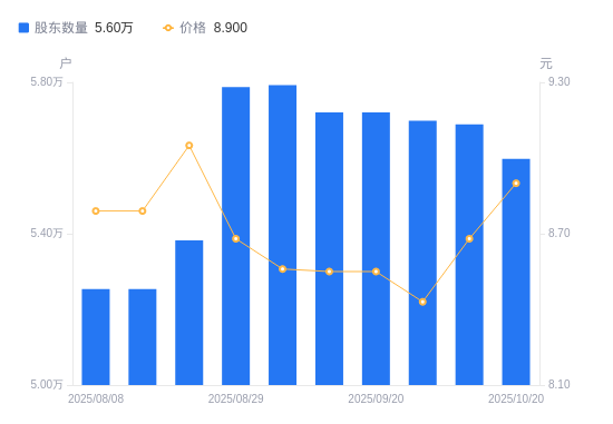 近一年(2024年10月31日至2025年10月20日),承德露露A股股东户数从5.1万户,增加至5.6万户,增幅9.84%,区间股价上涨3.96%。