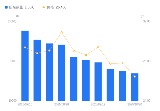 近一年(2024年10月31日至2025年10月20日),锋尚文化A股股东户数从1.26万户,增加至1.35万户,增幅6.95%,区间股价上涨6.90%。