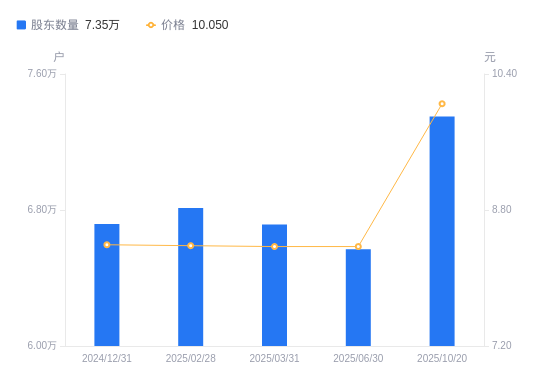近一年(2024年12月31日至2025年10月20日),安科生物A股股东户数从6.72万户,增加至7.35万户,增幅9.42%,区间股价上涨15.90%。