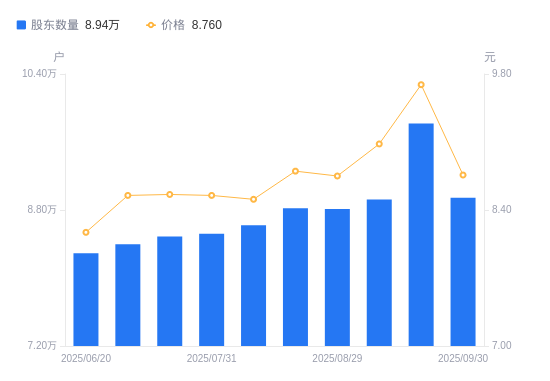 近一年(2024年10月31日至2025年10月20日),宋城演艺A股股东户数从8.05万户,增加至8.64万户,增幅7.44%,区间股价下跌14.36%。